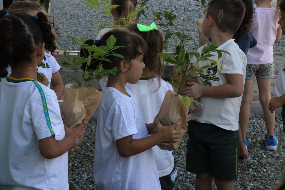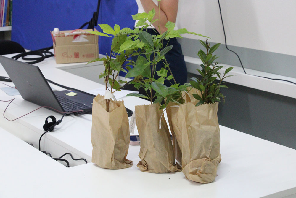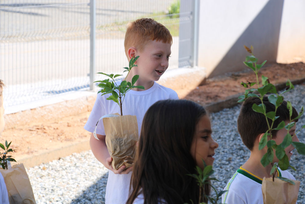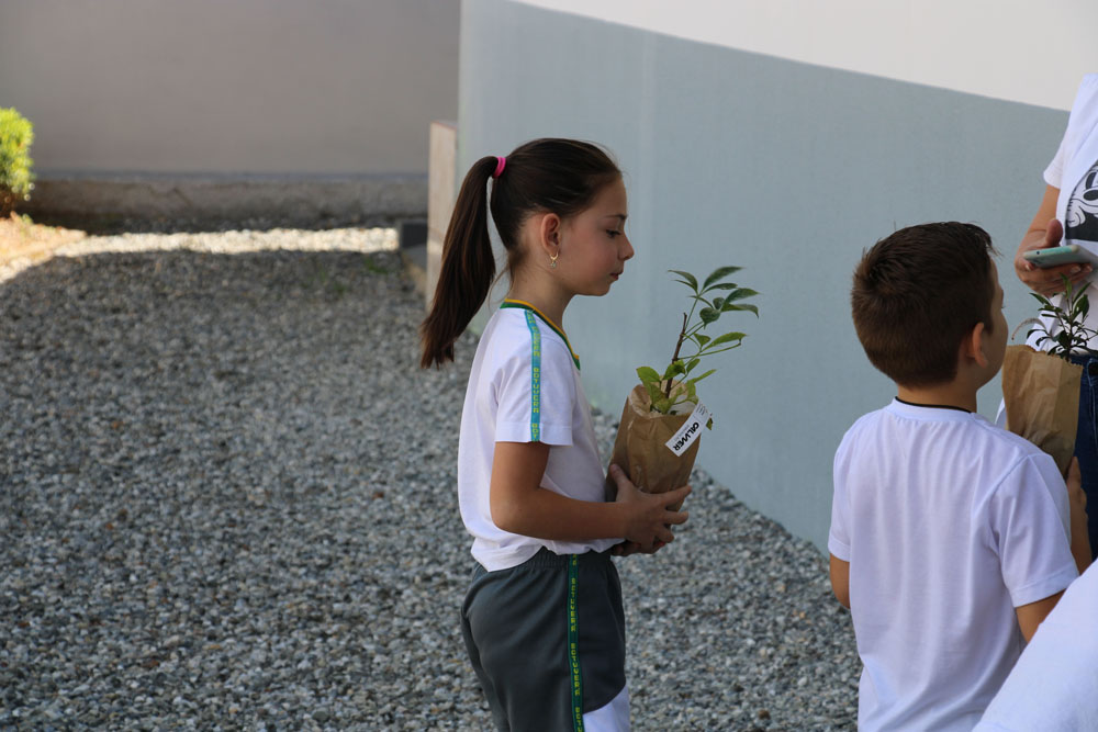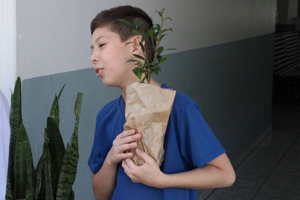 Ao final da palestra, cada aluno recebeu uma muda de árvore nativa. Eles puderam escolher entre Ipê-amarelo, Gabiroba, Araçá e Cerejeira.