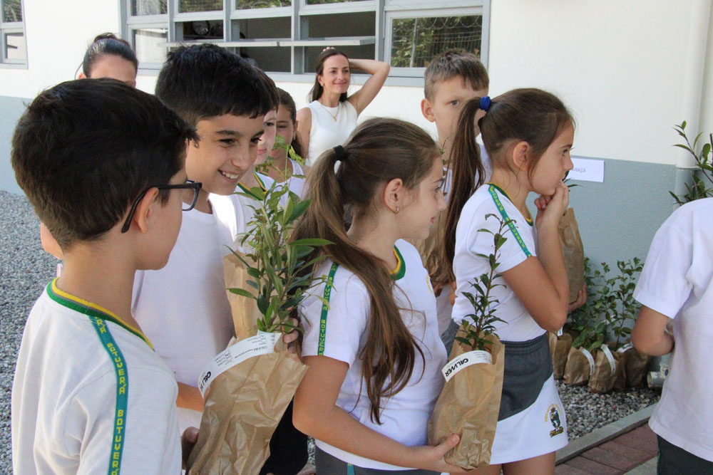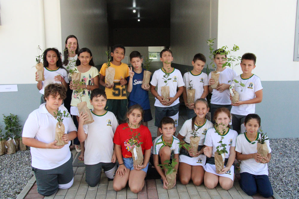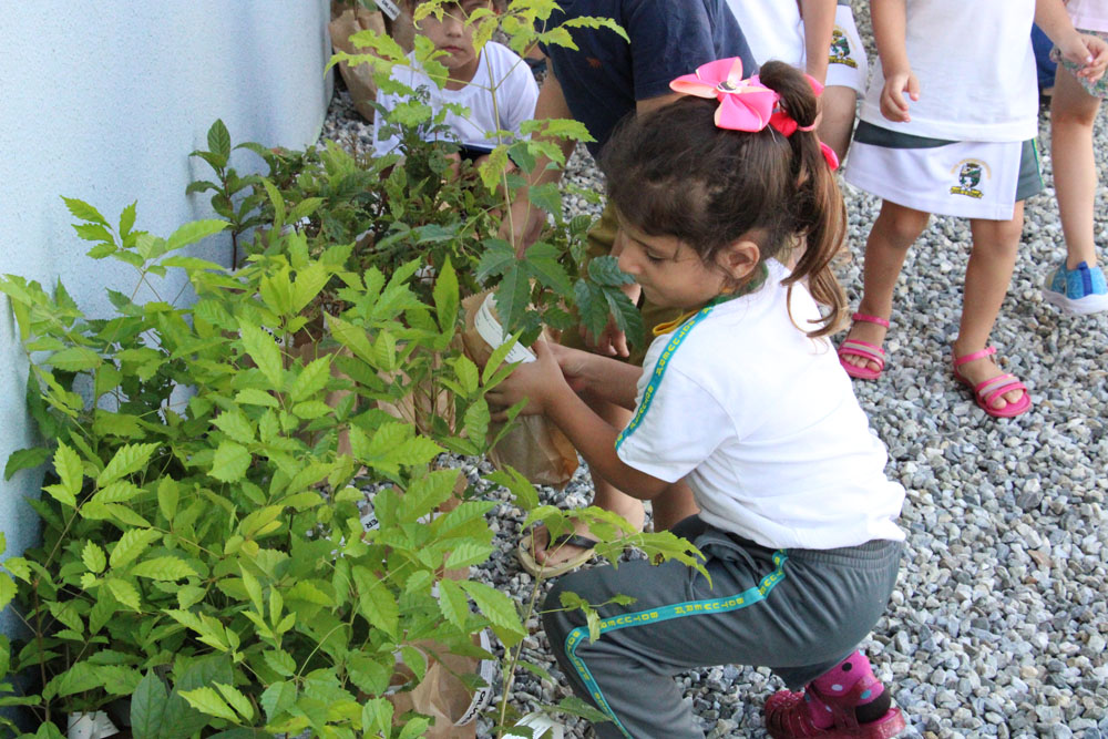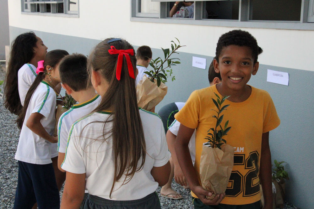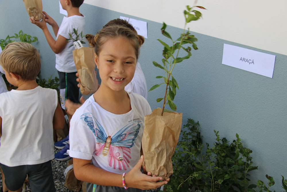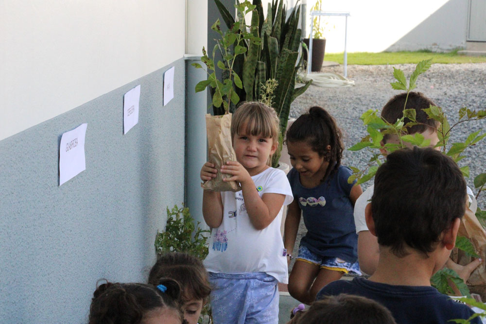 Ao final da palestra, cada aluno recebeu uma muda de árvore nativa. Eles puderam escolher entre Ipê-amarelo, Gabiroba, Araçá e Cerejeira.